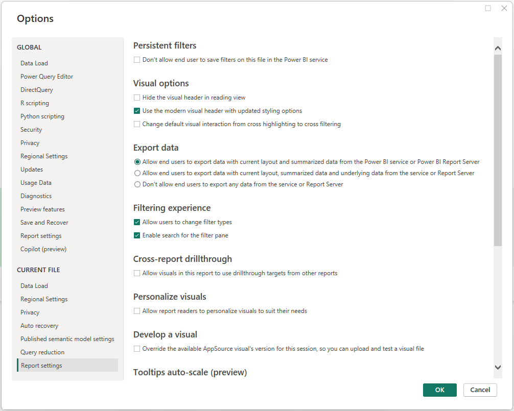 În File, selectăm Options and settings, după care bifăm Options. Se va deschide o nouă fereastră, cu mai multe setări pe care le putem face în Power BI, dar și în raportul nostru.