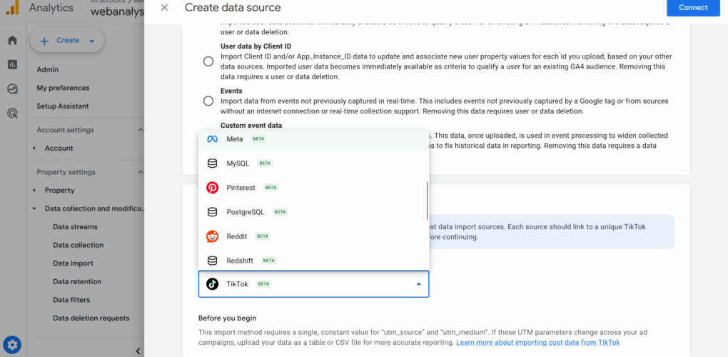 Google Analytics 4 a introdus recent importul nativ de date din principalele platforme de publicitate online. Reclamele din Facebook, Instagram, TikTok, Snapchat, Reddit sau Pinterest pot acum să trimită automat datele spre analytics.